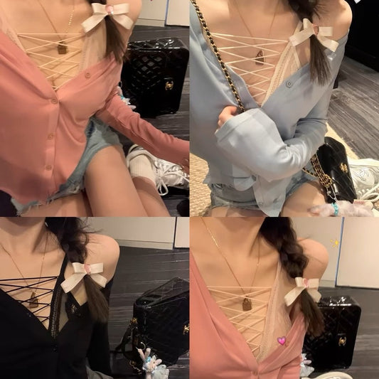 French Thin Large V Sexy Lace Tie-Up Support Anti-Sagging Soft Steel Ring Bra Set